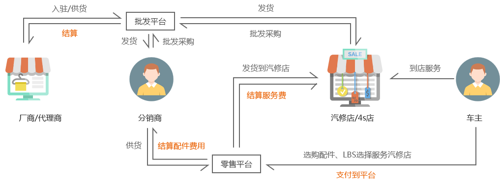 整合供应链,构建从厂家-经销商-4S店/汽修店-车主的一体化供销平台,线上集客、咨询下单,线下实体店提供落地服务,提高用户粘性